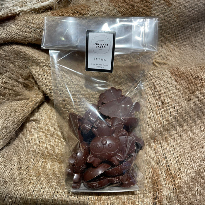 Chocolat noir : fèves de cacao pure origine, sucre, beurre de cacao) Chocolat au lait : fèves de cacao pure origine, sucre, lait (lactose), beurre de cacao).